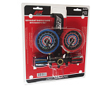Манометрический коллектор для хладагента R-12. К штуцерам подключаются шланги для заправки хладагента или проверки давления, а вентили обеспечивают герметичность контуров и простую регулировку подачи хладагента.
