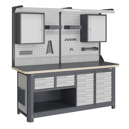 Однотумбовый. Допустимая нагрузка на столешницу 750 кг. Опорные элементы выполнены сварными из холоднокатаной стали. Для выполнения сборочных, ремонтных, слесарных, монтажных и других видов работ на производстве, в сервисных центрах, мастерских, гаражах, а также для обучения технологии в учебных заведениях. Комплектуется полкой-стенкой, расположенной под столешницей для удобного размещения габаритного инструмента и оснастки. Размеры верстака: 855x1596x696 мм. Вес: 68 кг. Поставляется в 4 комплектациях на выбор.