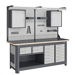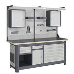 Нагрузка на столешницу 1500 кг. Столешница из листа влагостойкой фанеры марки ФСФ толщиной 40 мм и листом горячекатаной стали толщиной 5 мм. Рама верстака выполнена их холоднокатаной стали. Модуль верстака выполнен сварными. Ящики в модулях устанавливаются на шариковых телескопических направляющих полного выдвижения. Квадратная перфорация для установки крючков, держателей. Размеры: 1982x1493x743 мм