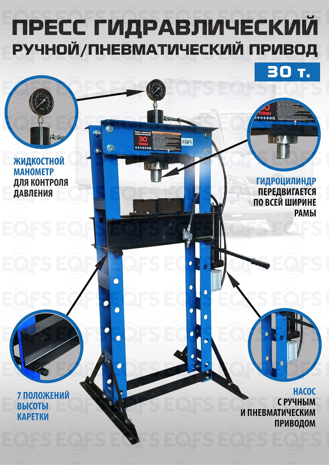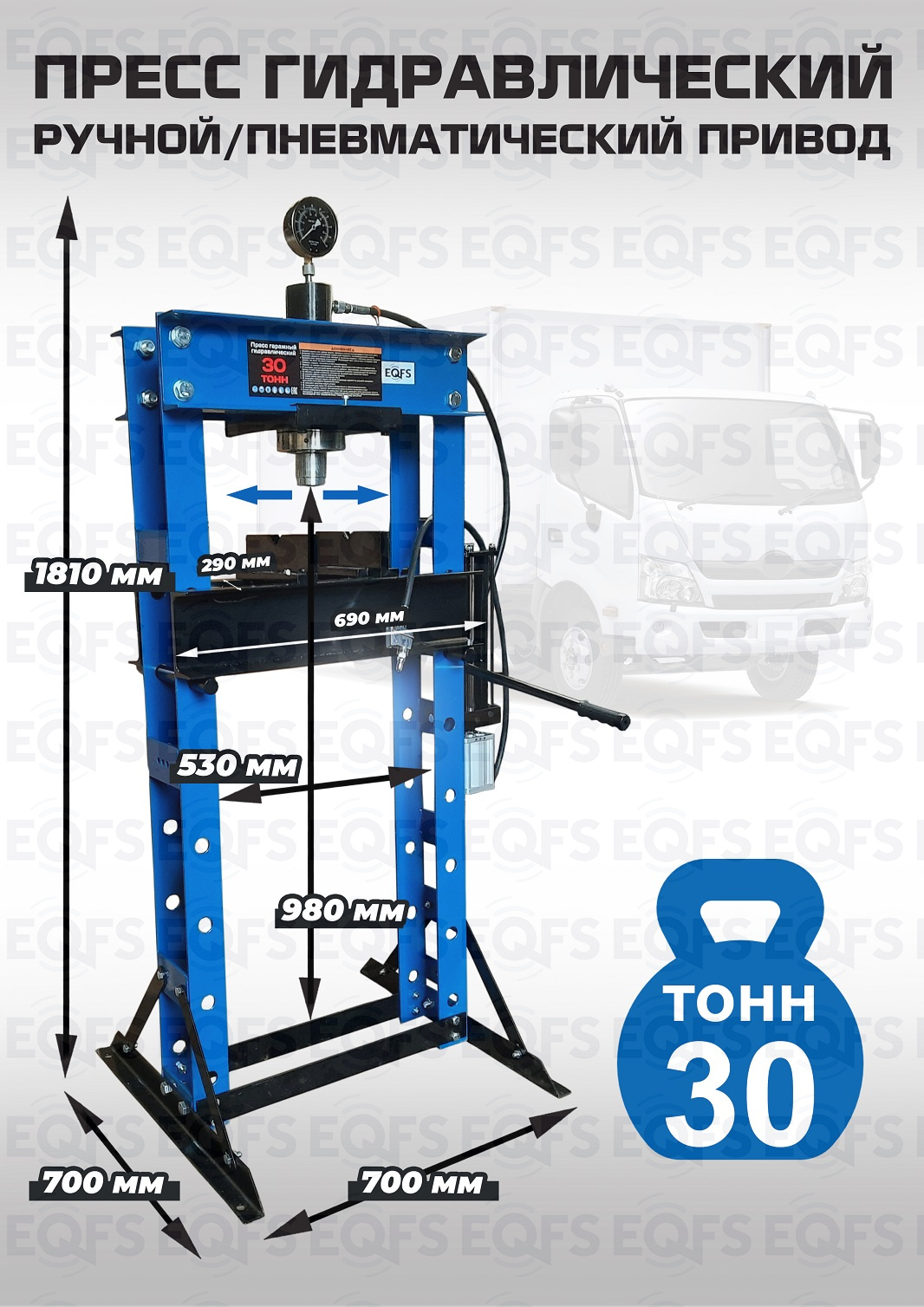 Пресс гидравлический оснащен насосом с ручными и пневматическим приводом с максимальным усилием 30т.