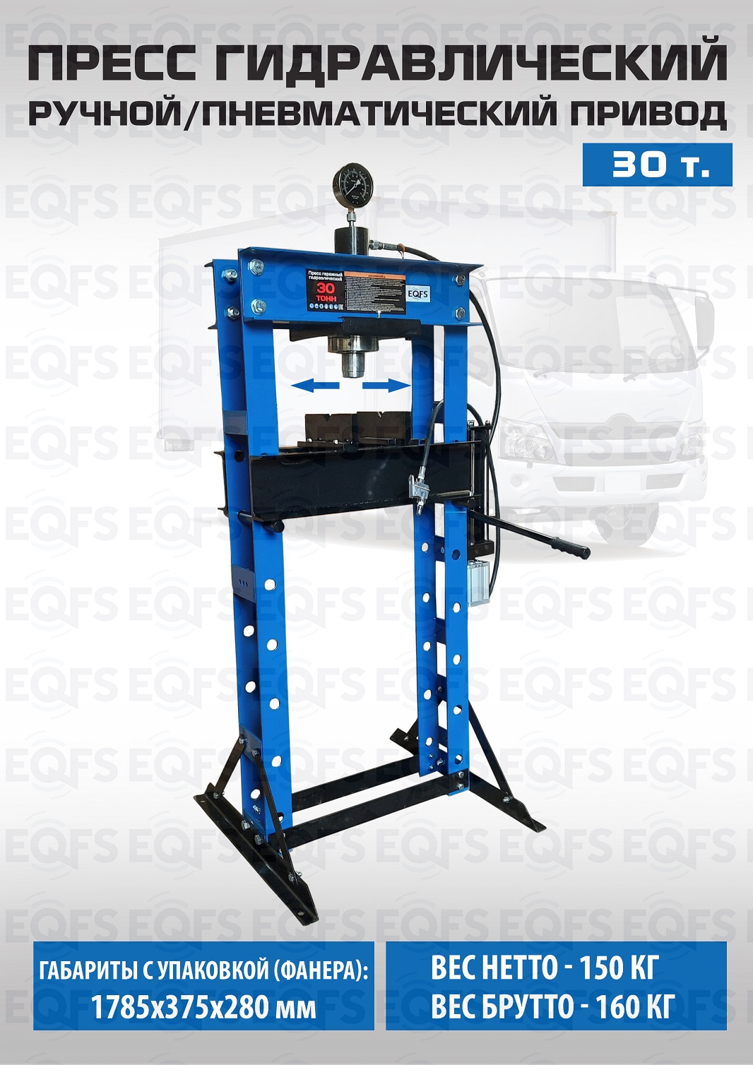 Пресс гидравлический 30 тонн. Управление ручное/пневматическое, манометр, гидроцилиндр с пуансоном перемещается по всей ширине каретки. Рекомендуется для выпрессовки подшипников, деталей машин, втулок и т.п. в автосервисе, Гараже и СТО. Подъёмная площадка регулируется по высоте и фиксируется в требуемом положении. Ход поршня 0-160 мм. Рабочее окно 530х980 мм. Давление воздуха 0,85 Мпа. Доставка по РФ и ТС.