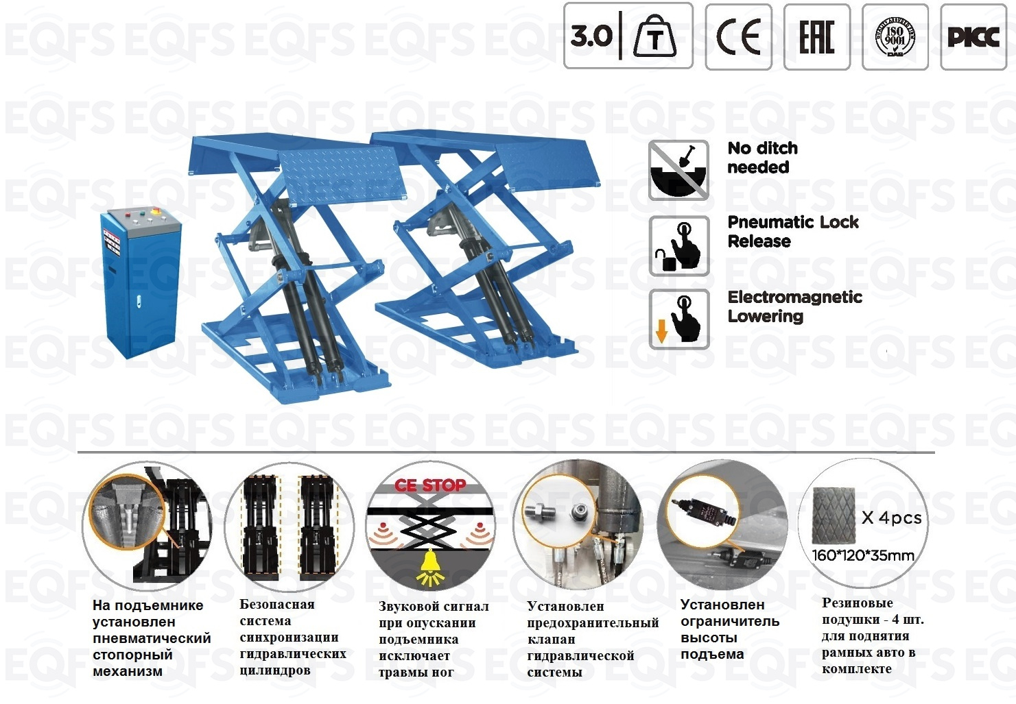 Ножничный подъемник гидравлический, напольный г/п 3,0 тонны с пневматическими стопорами. Применим для кузовных цехов, шиномонтажных мастерских и зоны активной приемки в автосервис. Подъём 4-мя гидроцилиндрами, что позволяет легко поднимать любой автомобиль массой 3 тонны. Итальянская гидравлика!  Высота подъема 105-1850 мм. Длина платформ 1450-1870 мм. Гарантия до 24 месяца.