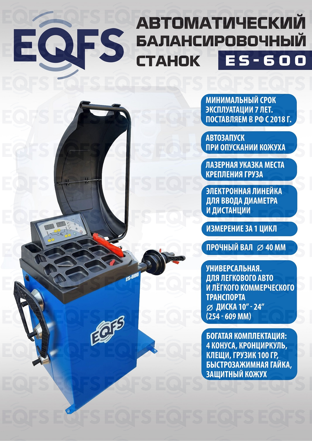ES-600 Балансировочный станок. Автомат. Для колес легковых автомобилей, мотоциклов и легких грузовиков с диаметром диска с резиной до 800 мм. Размеры диска: ширина 3–10” (76-254 мм), диаметр диска 10–24” (254÷609 мм). Вал- 40мм. Гарантия 18 мес – наш монтаж, 12 мес – самостоятельная установка. В комплекте: кожух с автозапуском + клещи + кронциркуль + быстрозажимная гайка + набор конусов.