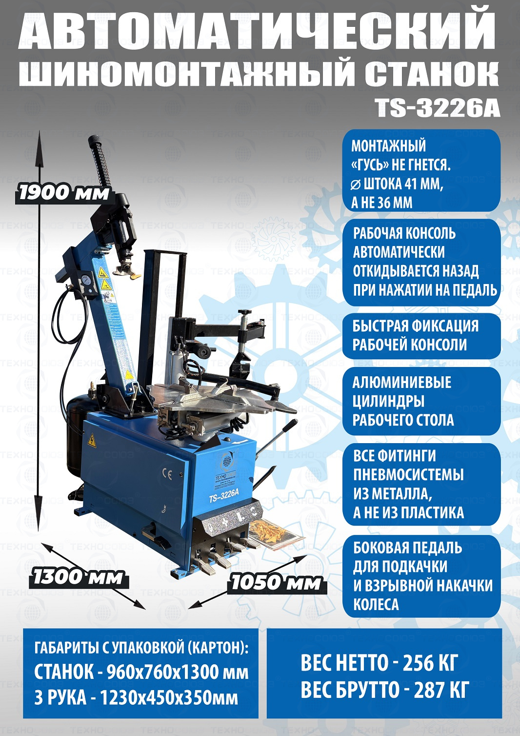 Автоматического шиномонтажного стенда TS-3226А предназначен для монтажа и демонтажа шин легковых автомобилей, внедорожников и легких грузовиков с размером колес от 11-24 дюйма. Усилие пневмоцилиндра в 2500 кг. В комплекте: полноценная 3-й рука для работы с жесткой и низкопрофильной резиной RUNFLAT. + встроенный бустер 24 литра (взрывная подкачка) + пистолет для подкачки шин + монтажка + регулятор давления с влагоотделителем и манометром. Напряжение шиномонтажных станков 220В или 380В на выбор.