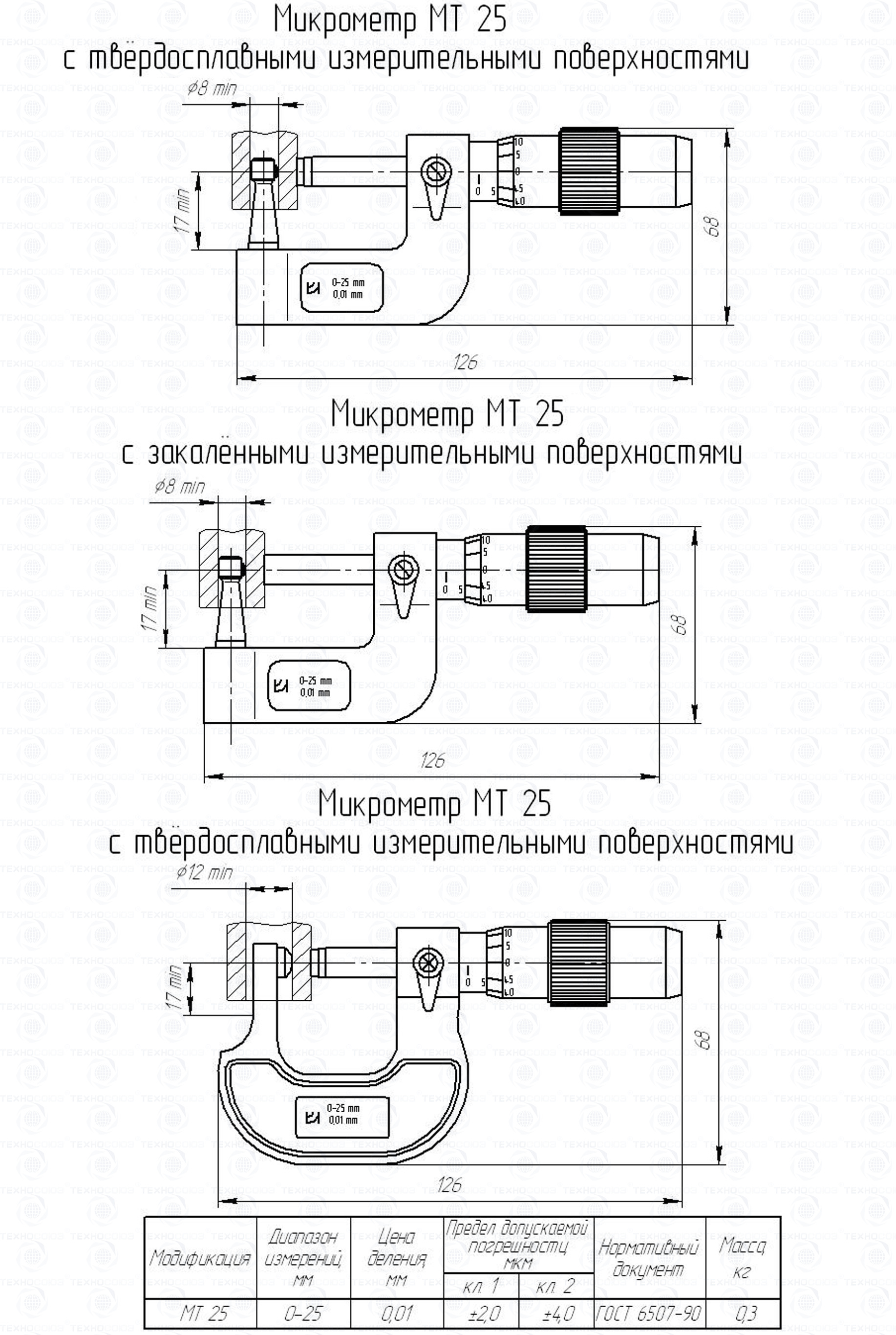 Пример условного обозначения микрометра 1-го класса точности с наименьшим внутренним диаметром измеряемых труб 8 мм - Микрометр МТ25-1-8 ГОСТ 6507-90.