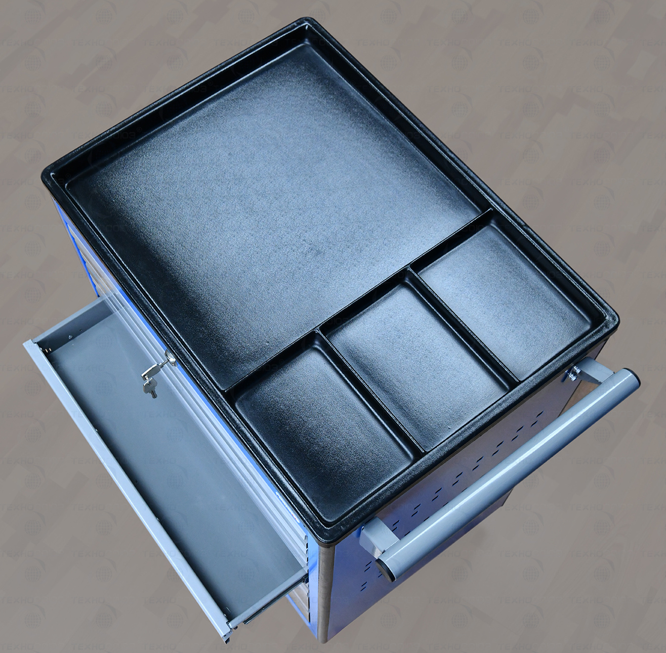 Все металлические элементы тележки покрыты полиэфирной порошковой краской, обеспечивающей хорошую износостойкость покрытия и стойкость его к моющим средствам и смазочным веществам. Цвет и текстура покрытия корпуса тележки RAL 5015, полуматовое. Цвет и текстура покрытия ящиков тележки RAL 7037, глянцевое. Цвет и текстура покрытия накладок на ящики RAL 9006, глянцевое.