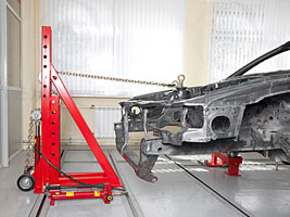 Для правки кузовов используются передвижные силовые устройства с усилием вытяжки 5 или 10 тон. Фиксация силового устройства производится в любом необходимом месте на раме с помощью кронштейнов и клиньев, после чего можно сразу приступать к вытяжке.