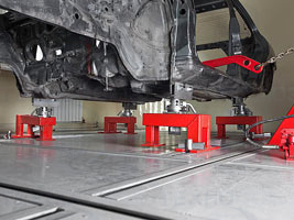 Основа кузовного стенда - модульная рама, которая собирается с помощью крепежных деталей и монтируется в подготовленный приямок заподлицо с полом. Модульная система позволяет легко собирать один или несколько постов необходимых размеров.