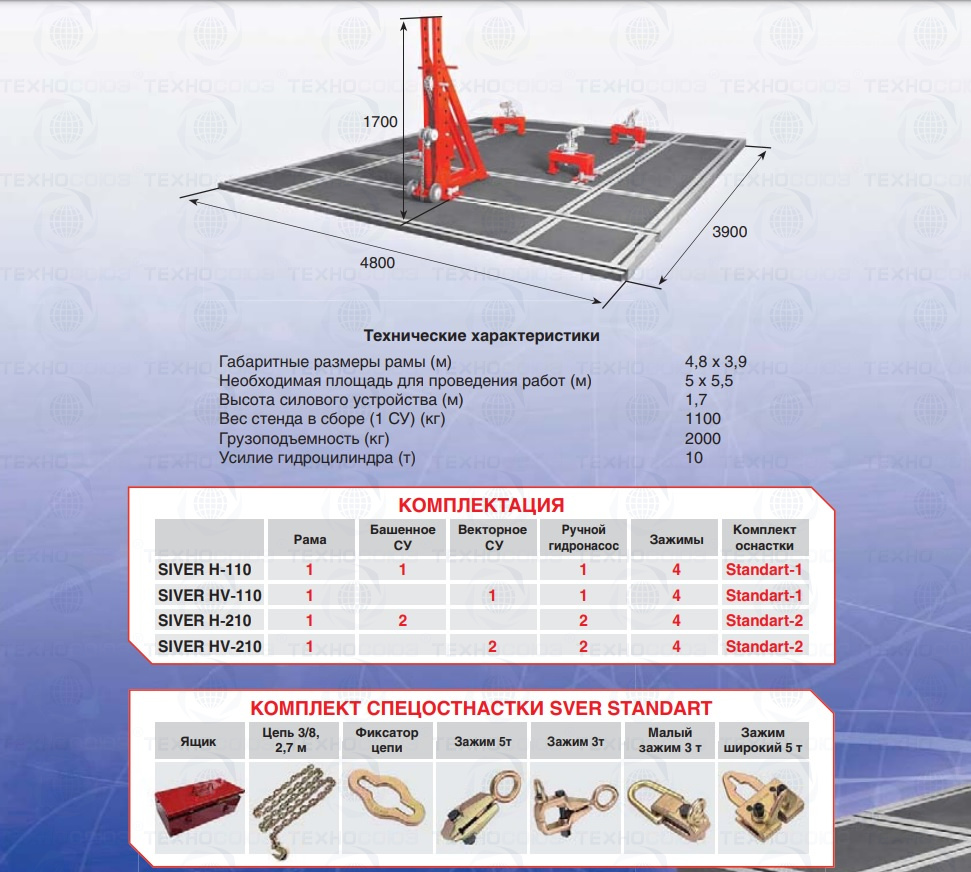Рама CH-01, 2 силовых устройства CH-10, 2 ручных гидронасоса, комплект захватов за отбортовку порогов (4 шт.), комплект оснастки Siver Standart-2