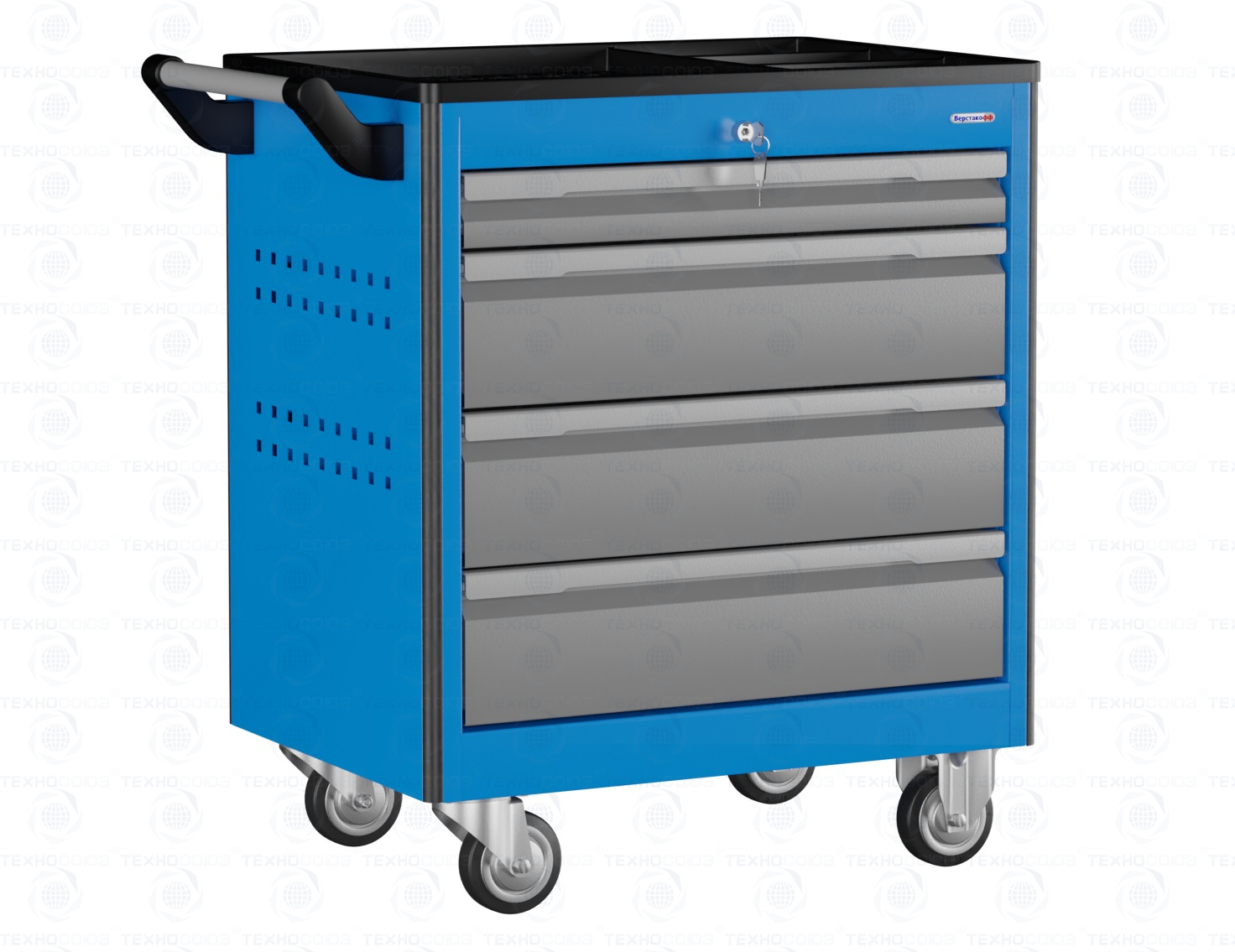 Тележка снабжена центральным замком с поворотом ригеля 180 градусов, который закрывает одновременно все ящики. Замок неподвижно и прочно закреплен на корпусе тележки. В комплекте имеется два ключа. Тяга замка подпружинена.