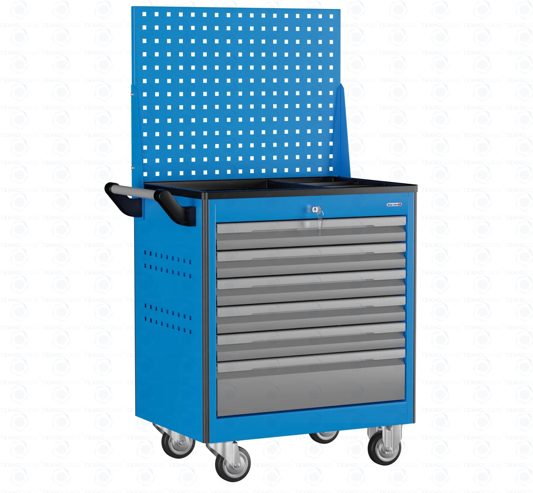 Тележка инструментальная TNC 795.6 Р с 6 выдвижными ящиками и перфорированным экраном. Предназначена для хранения и транспортировки к рабочему месту инструментов, приборов и другой оснастки, необходимых для работы на сервисных и слесарных участках, а также в цехах заводов и на промышленных предприятиях.